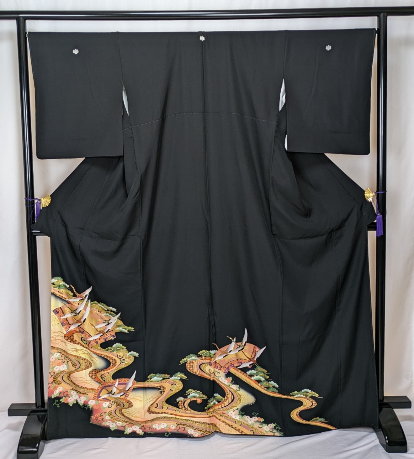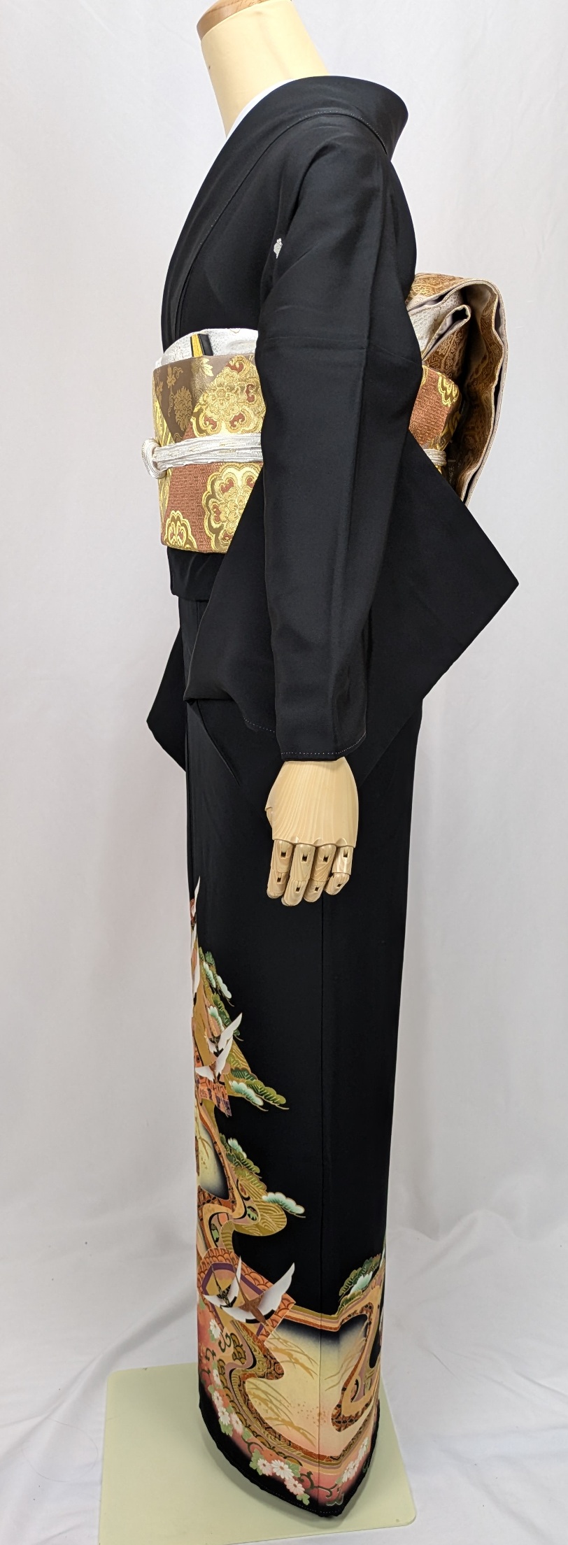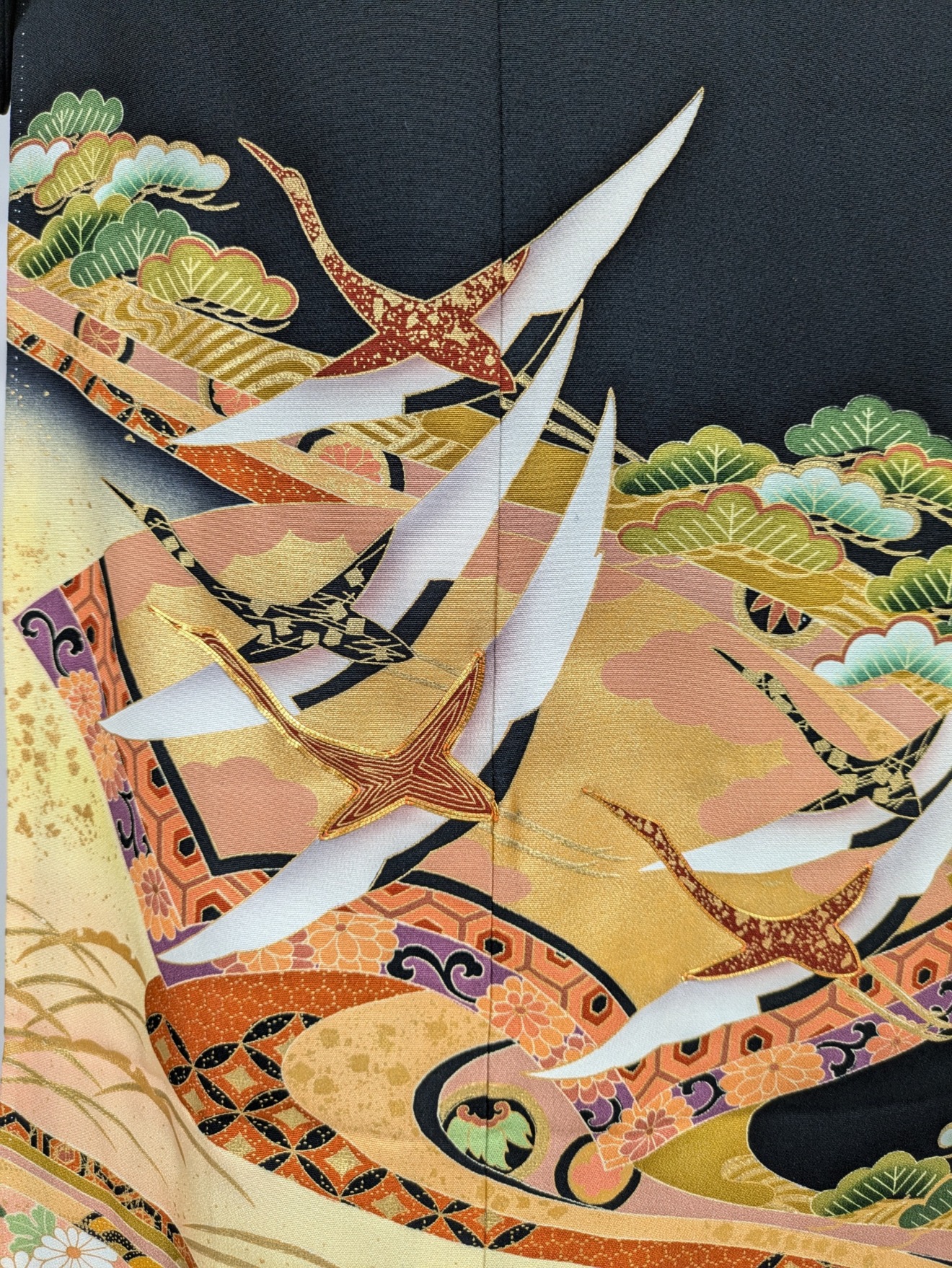 深みのある黒地に松に飛鶴の模様が描かれており、晴れの日にふさわしい華やかさを演出します。