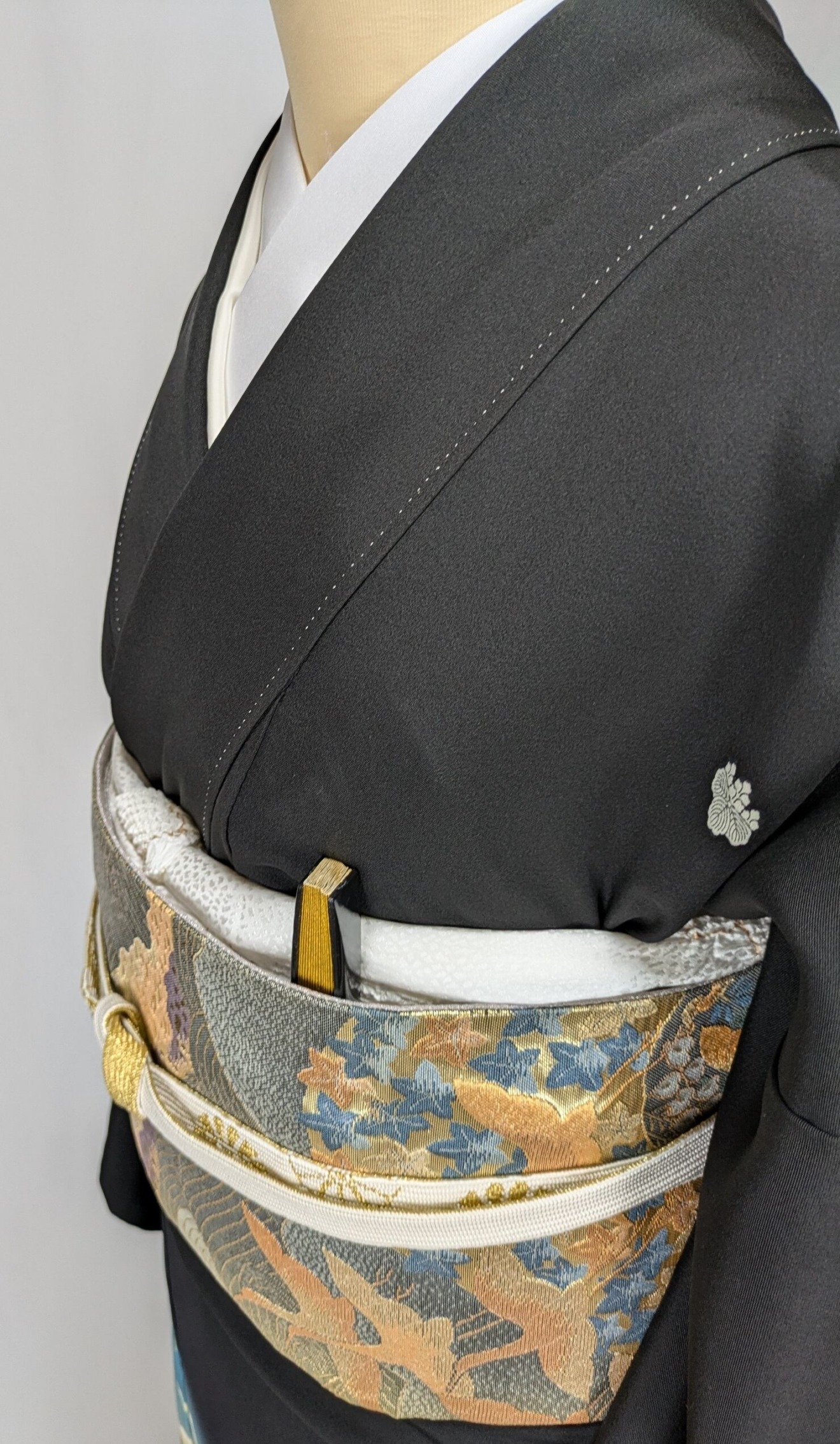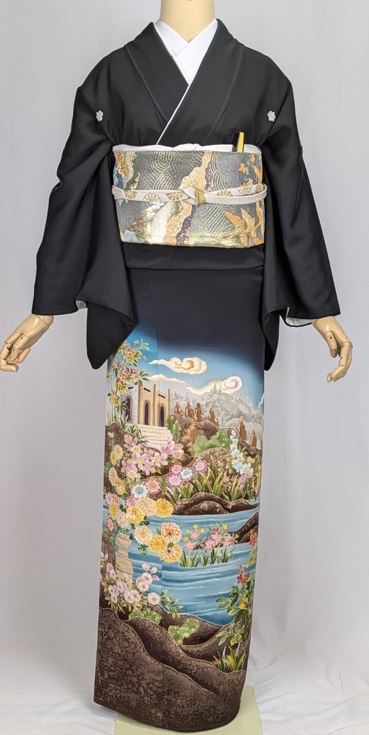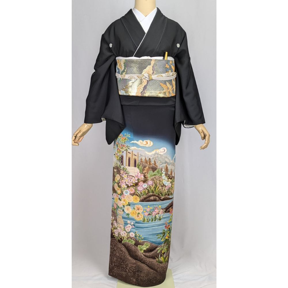 華やかなモチーフが施された黒留袖で、結婚式であっても存在感を放つ一着です。ゆったりとしたシルエットは、快適さを追求しつつも、品格を保つデザインとなっています。