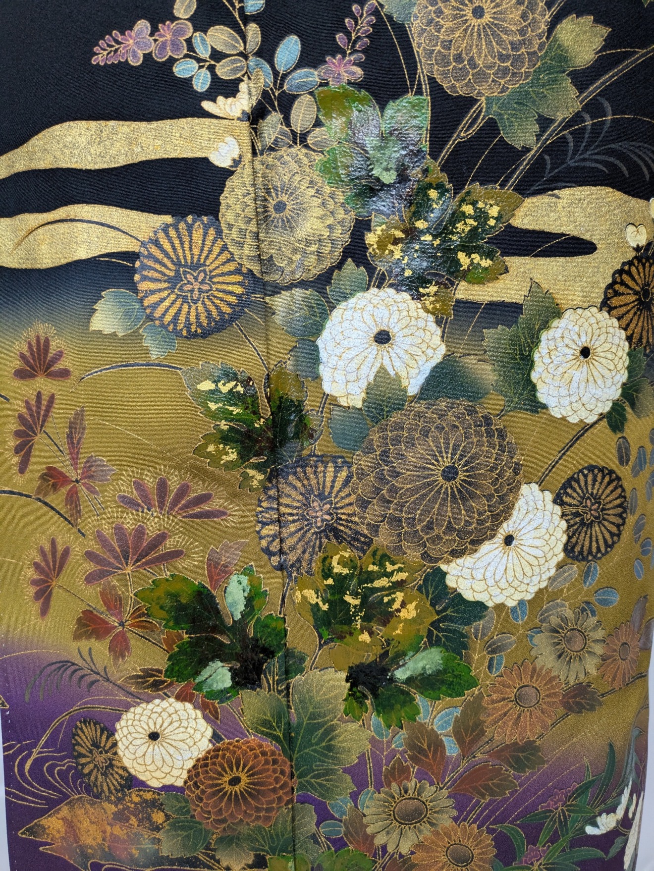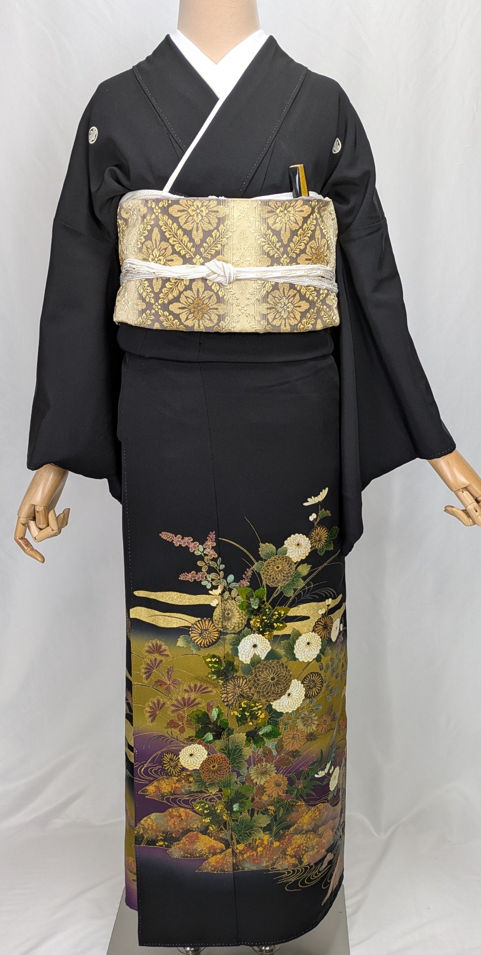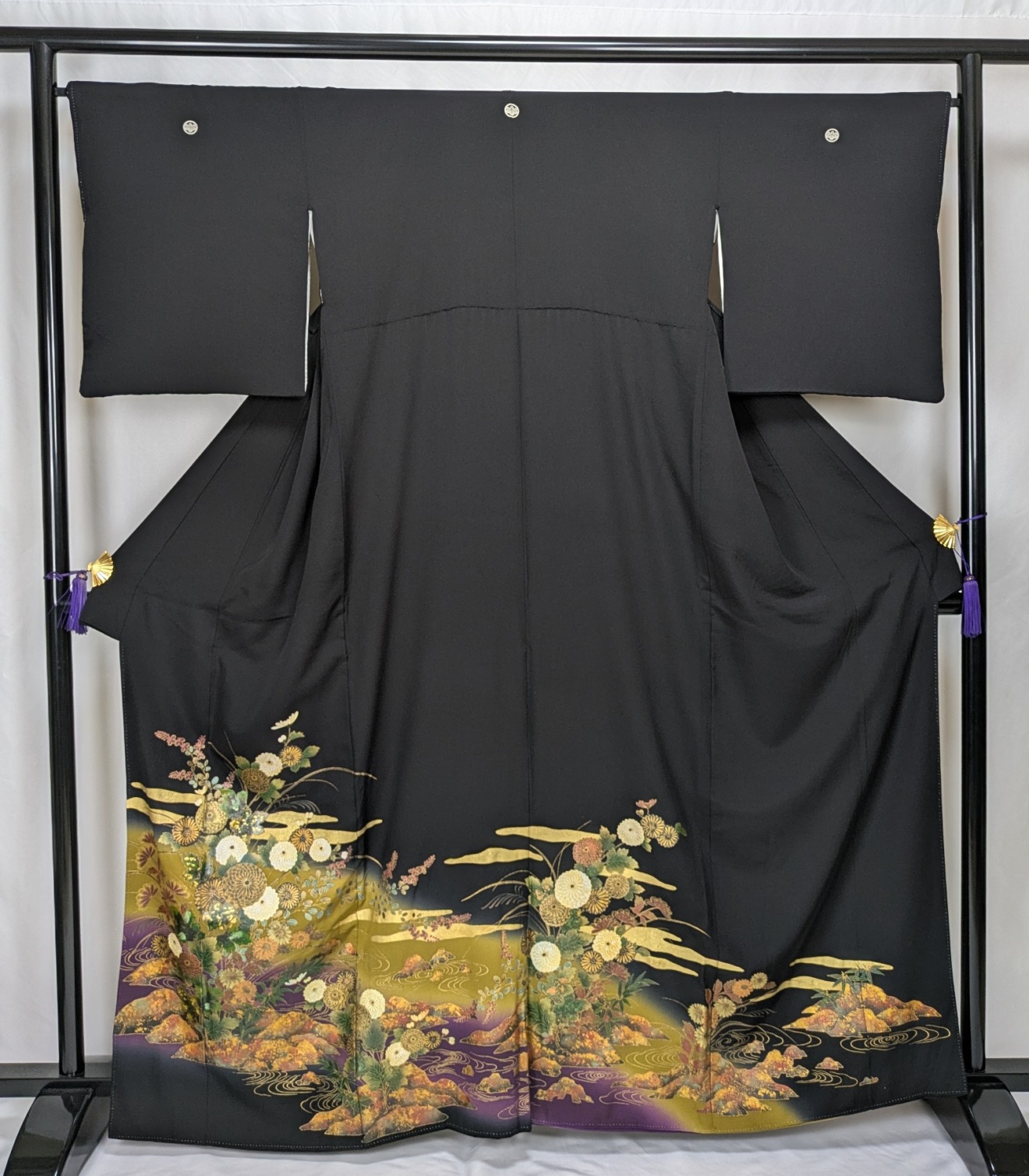 黒地に優雅な菊模様と流れる流水が描かれており、さまざまなシーンでその存在感を際立てます。