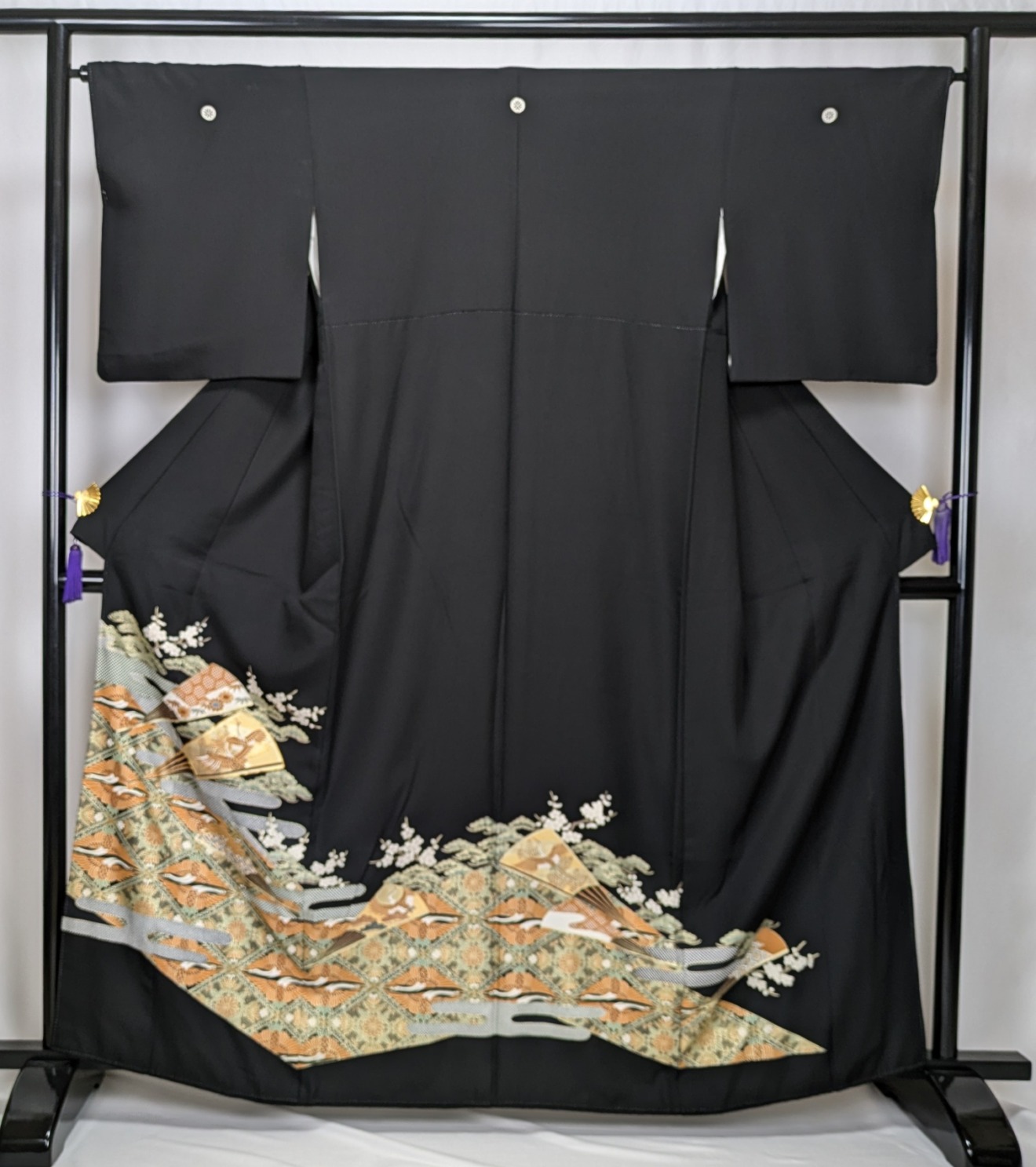 留袖(16412301 011004 LL38)は、結婚式などの特別なシーンにふさわしいエレガントな黒留袖です。松、扇面、そして鶴の美しいデザインが施されており、着用者に優雅な印象を与え、日本の伝統美を見事に表現しています。