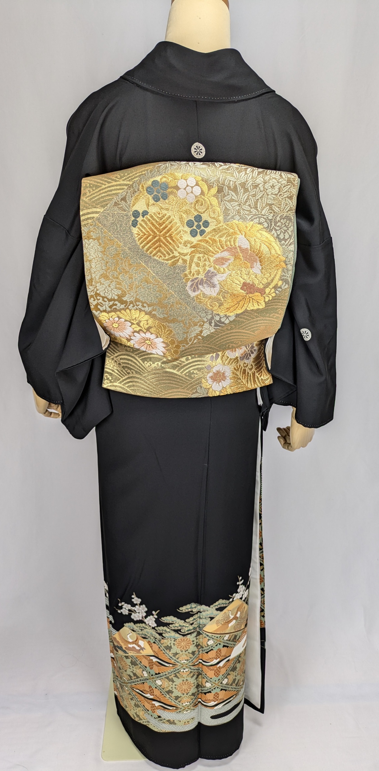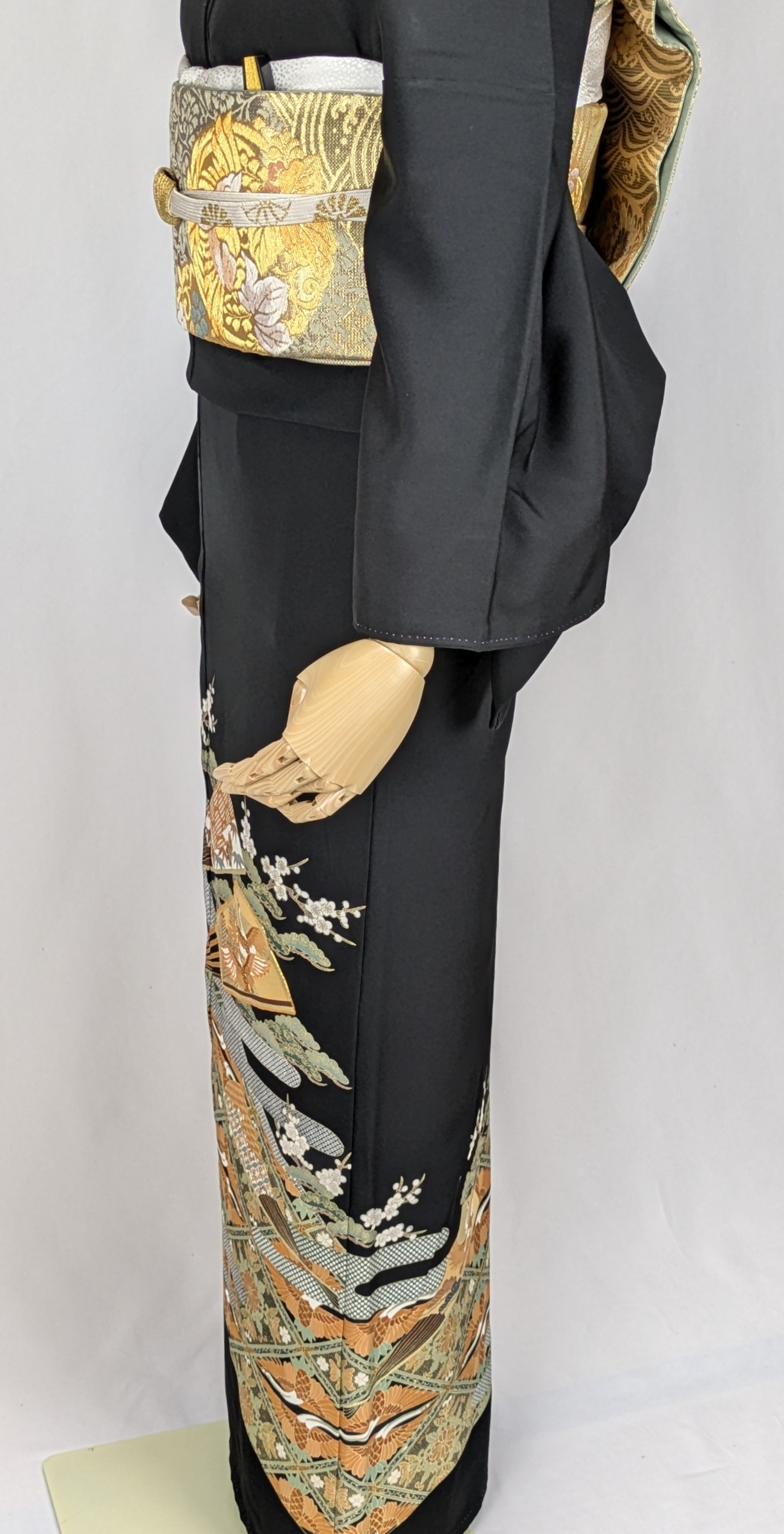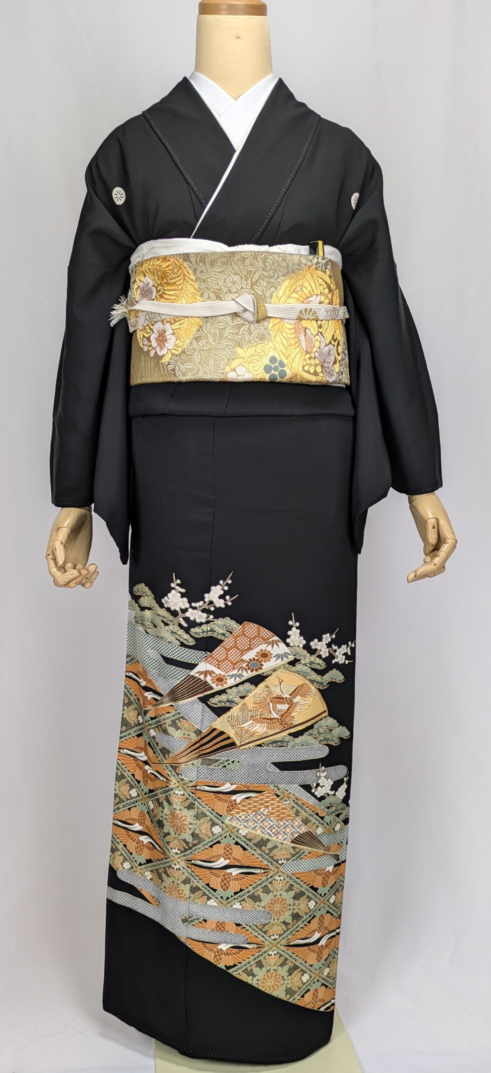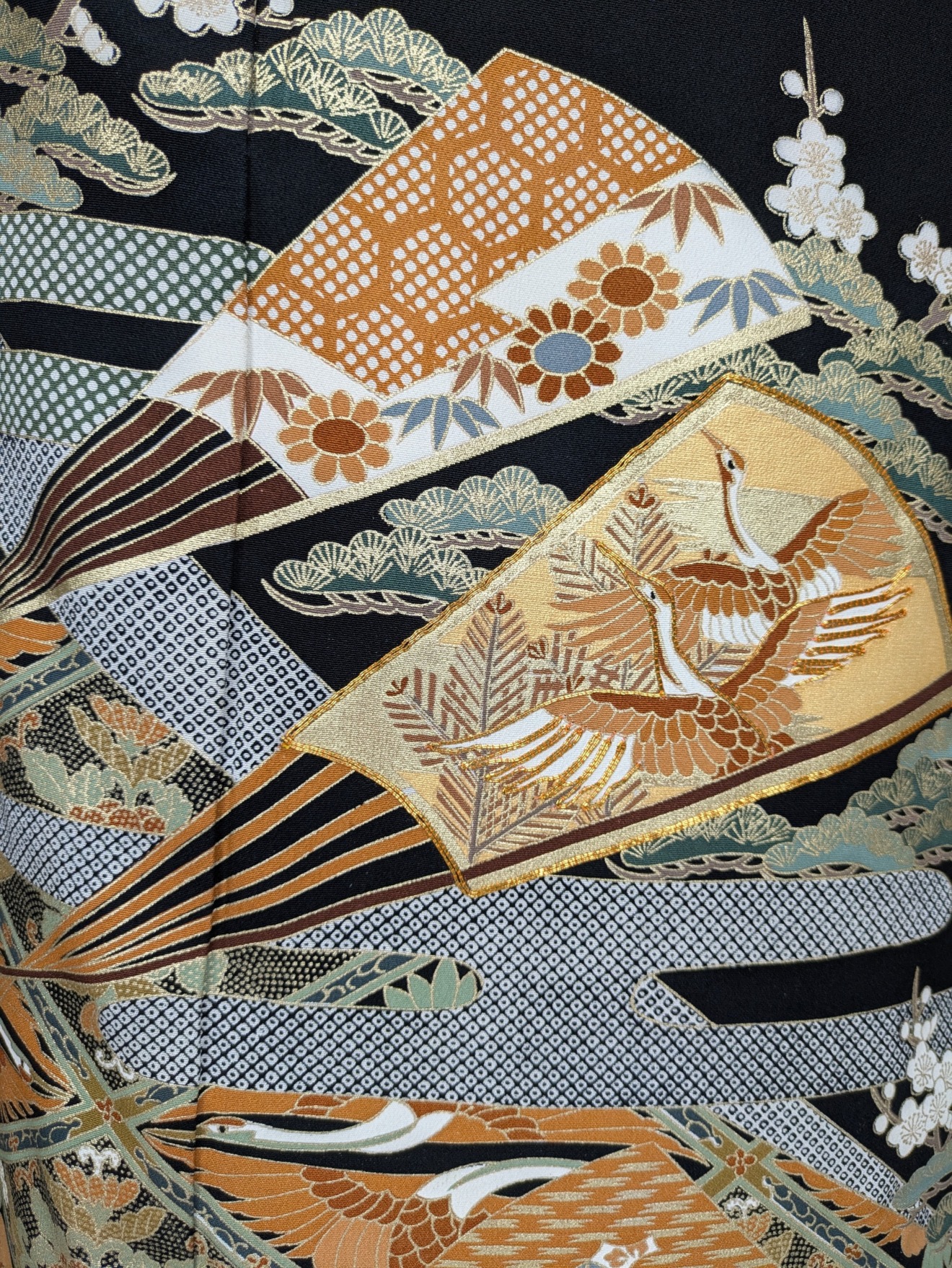 凛とした黒地に松や扇面、鶴の華やかな模様が描かれ、特別な日をさらに引き立てます。