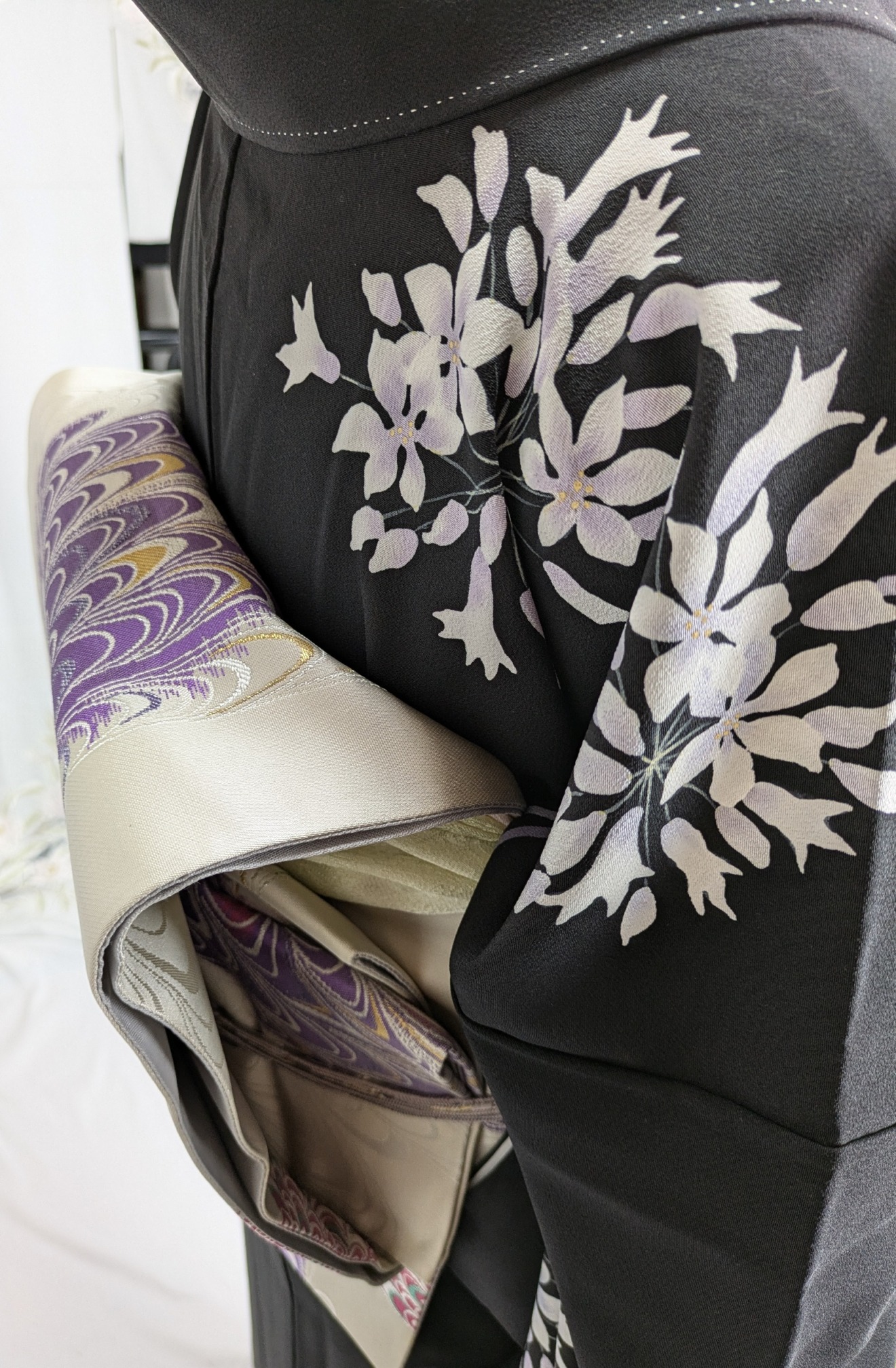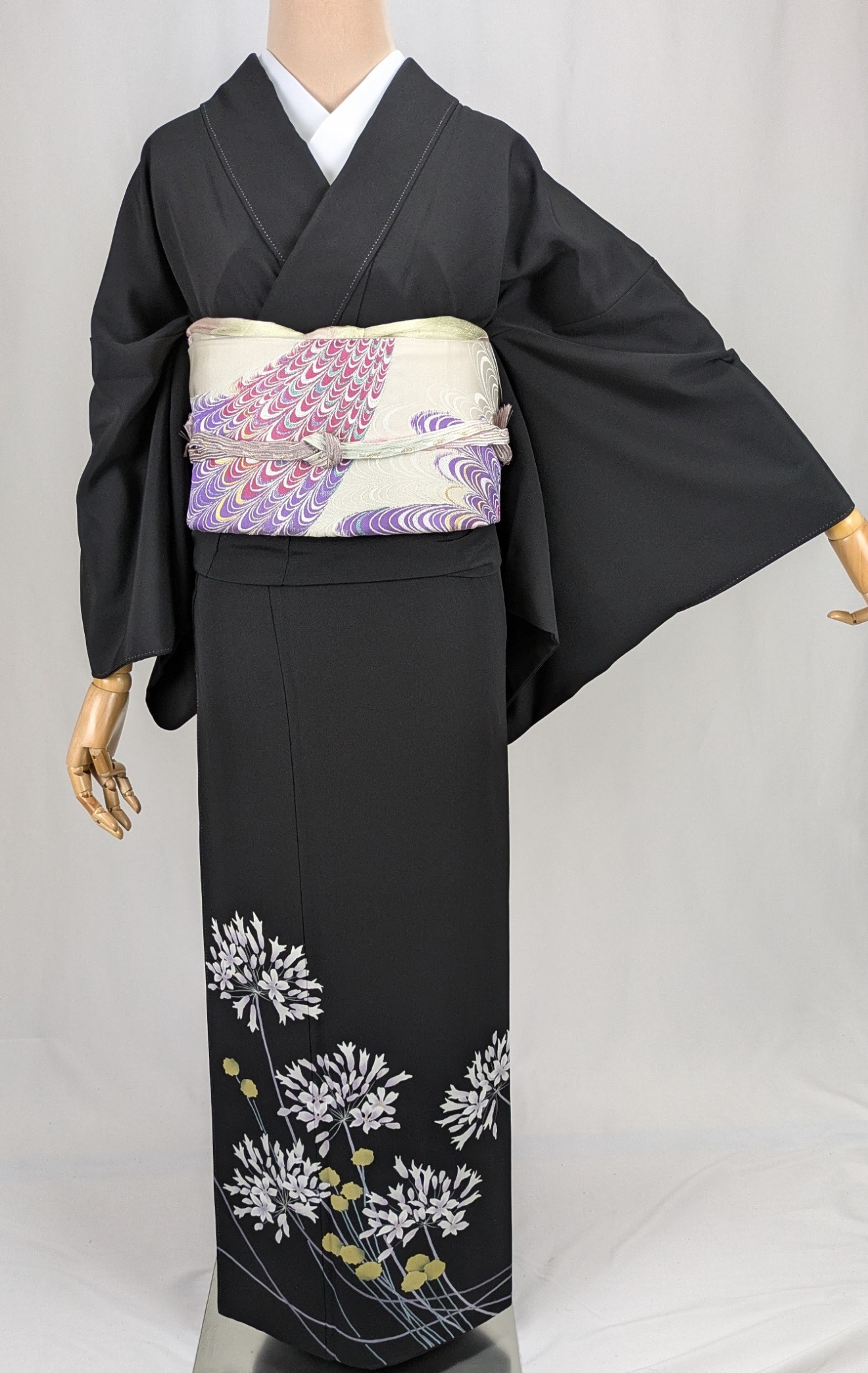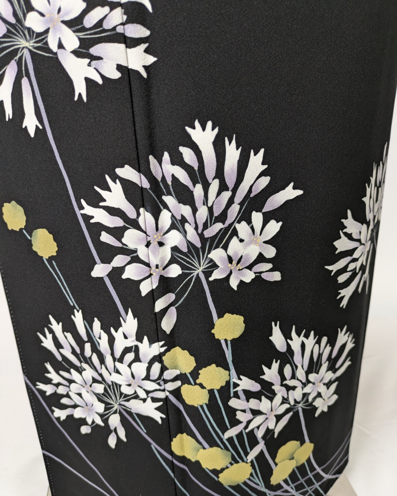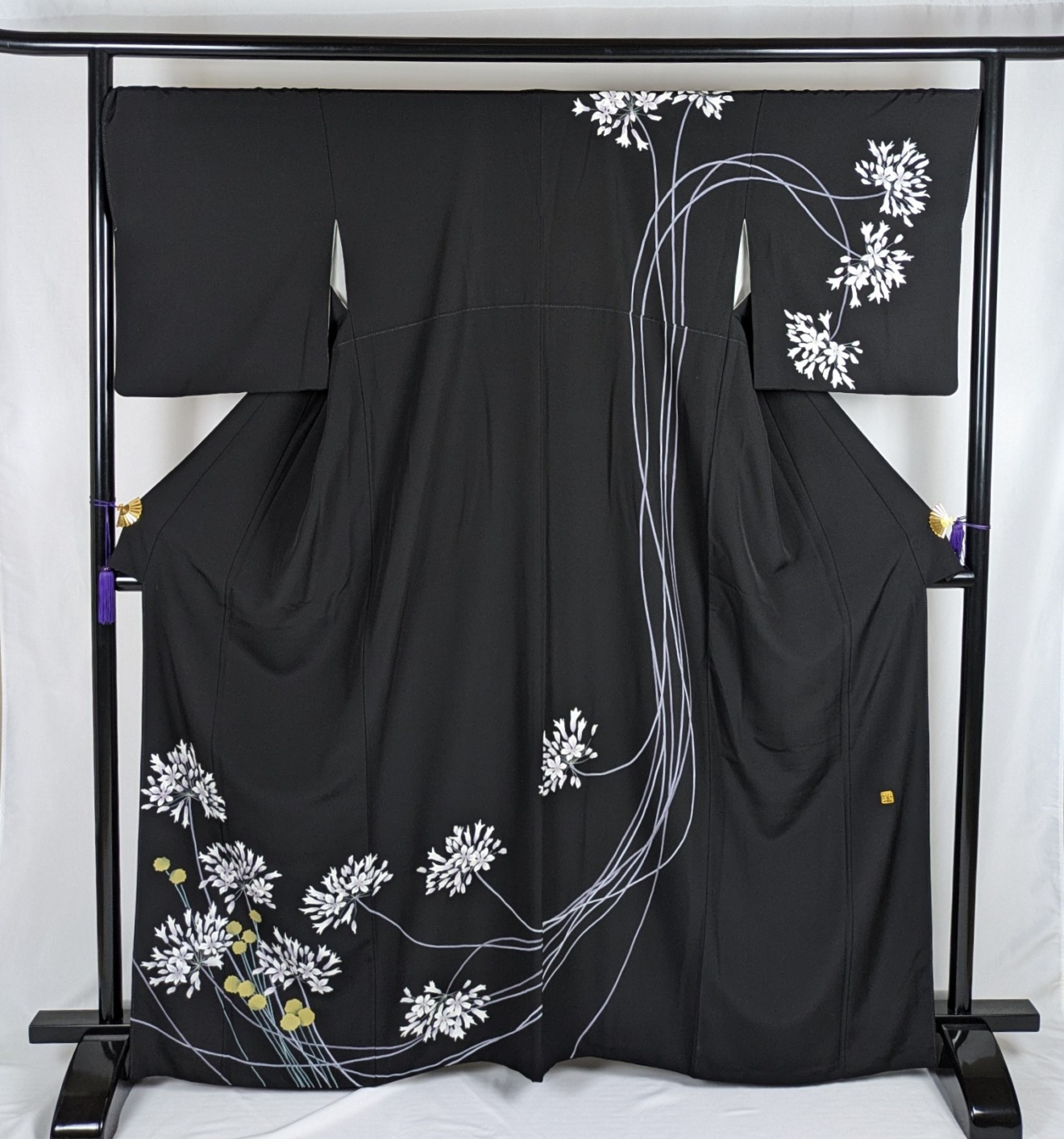 シックな黒地が重厚感を醸し出し、華やかな洋白花のデザインが目を惹きます。さまざまなイベントで際立つ存在感を放ちます。