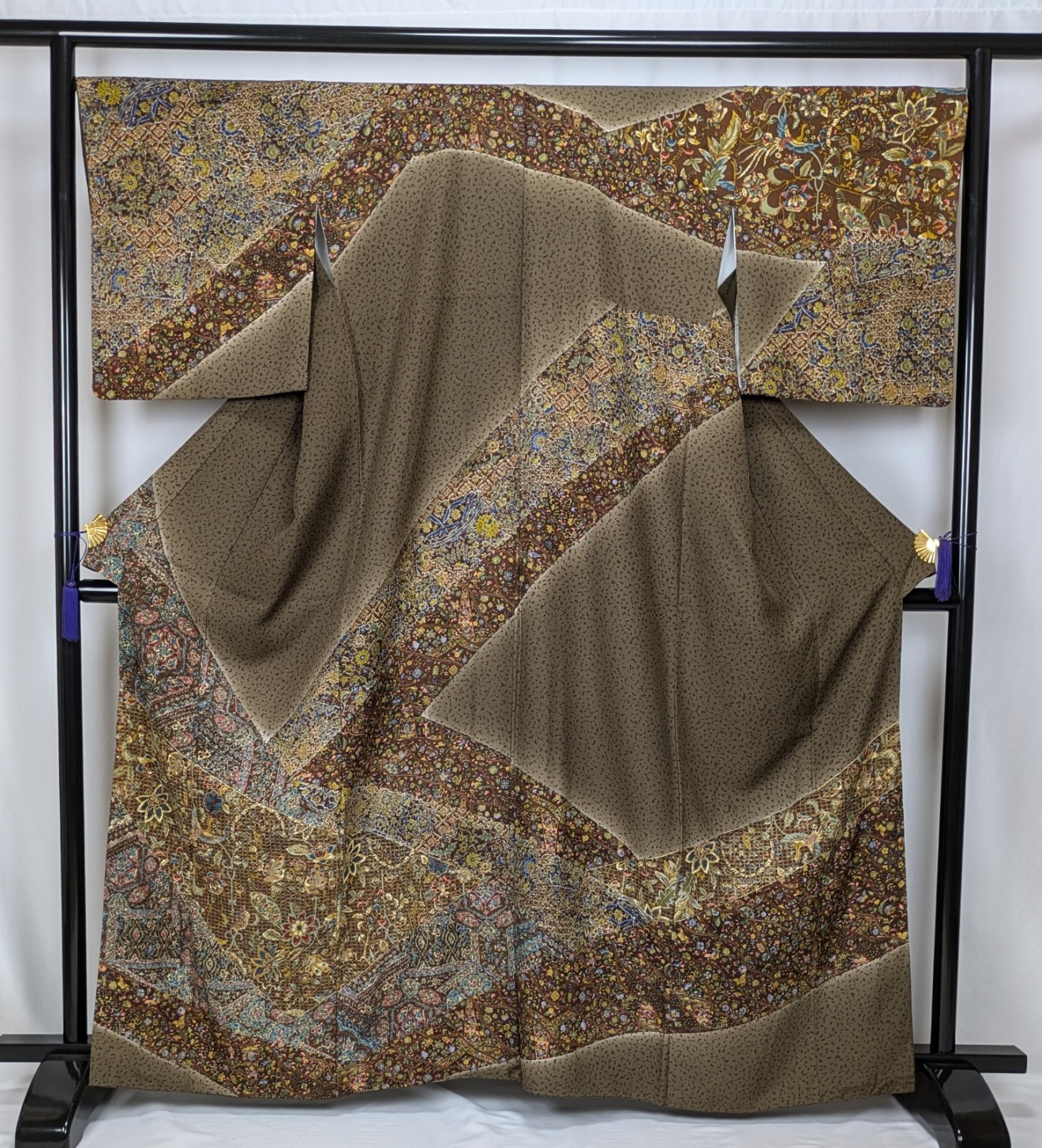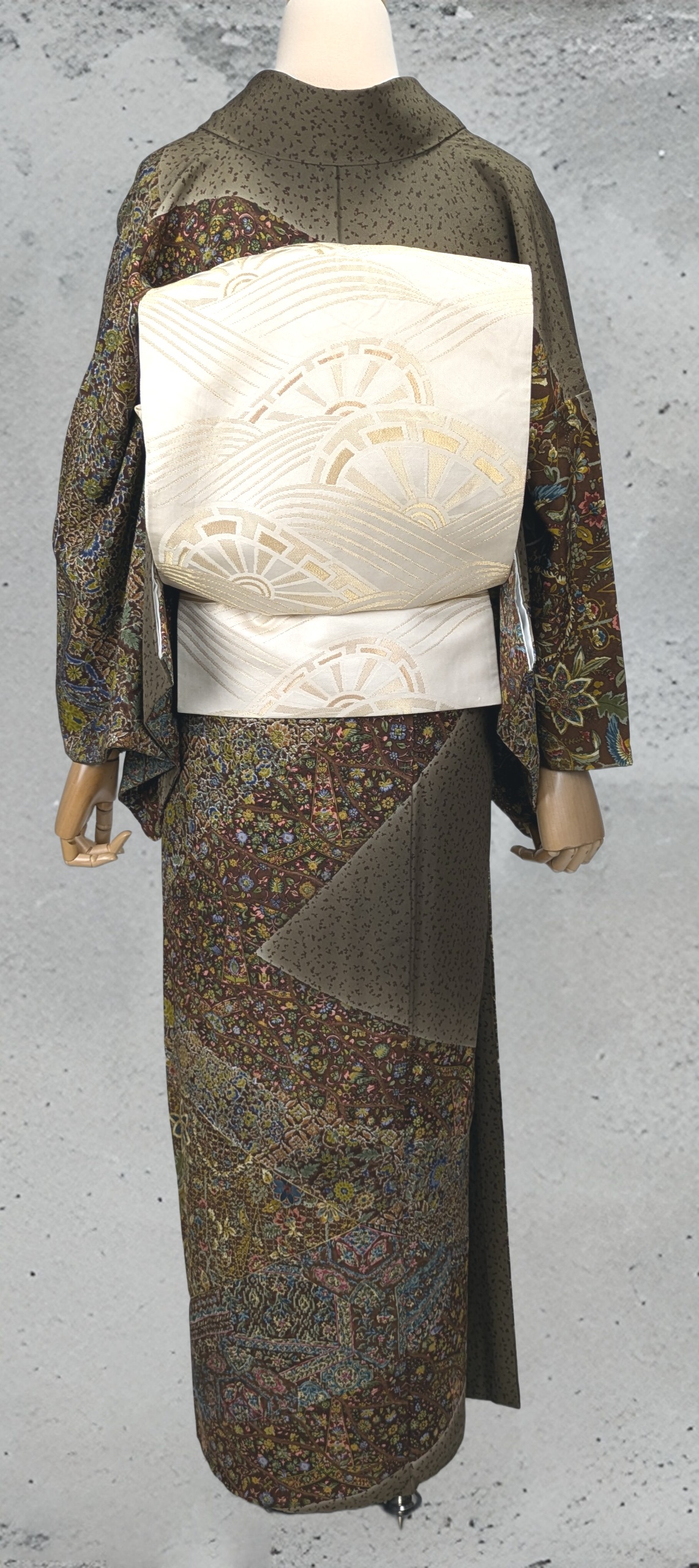 訪問着(37312407 041039 L51)は、特別な訪問やお祝いの席にぴったりな、洗練された和装です。多色使いの更紗文様が華やかに表現されており、着用者の魅力を引き立て、日本の伝統美を見事に体現しています。