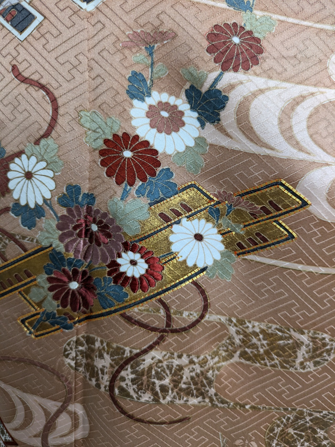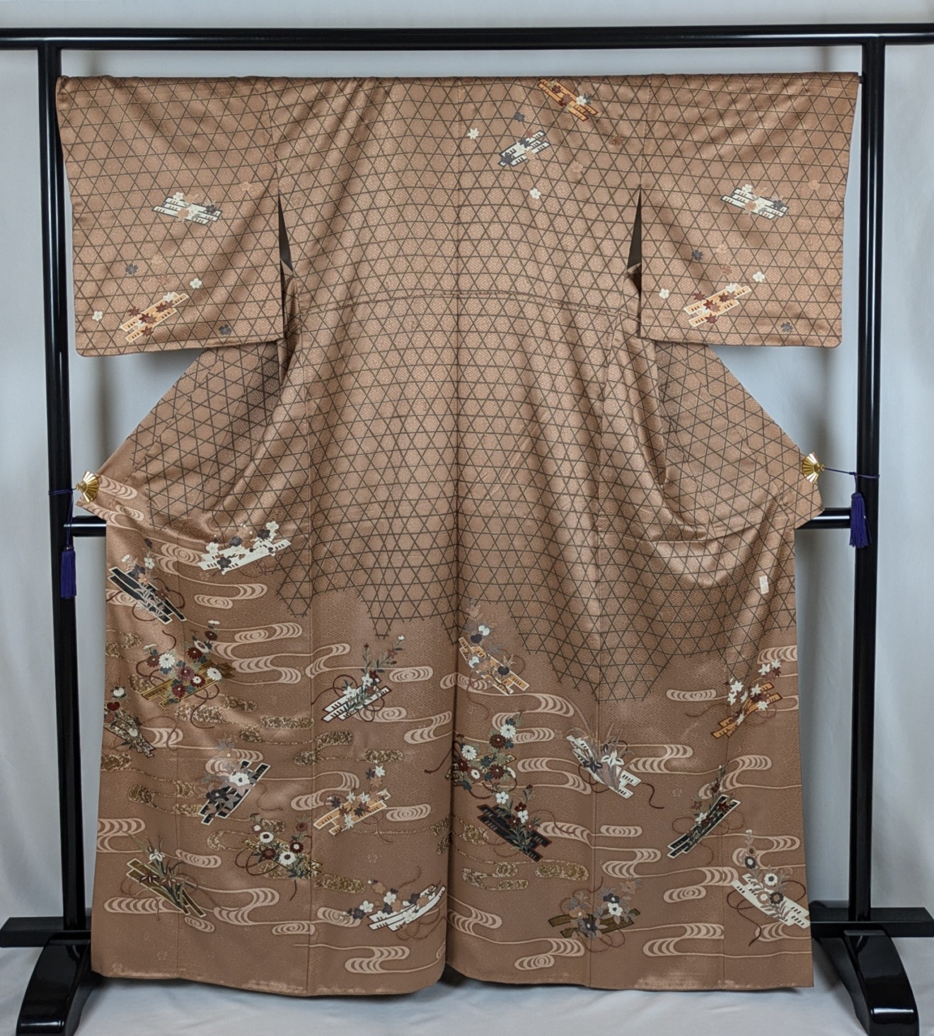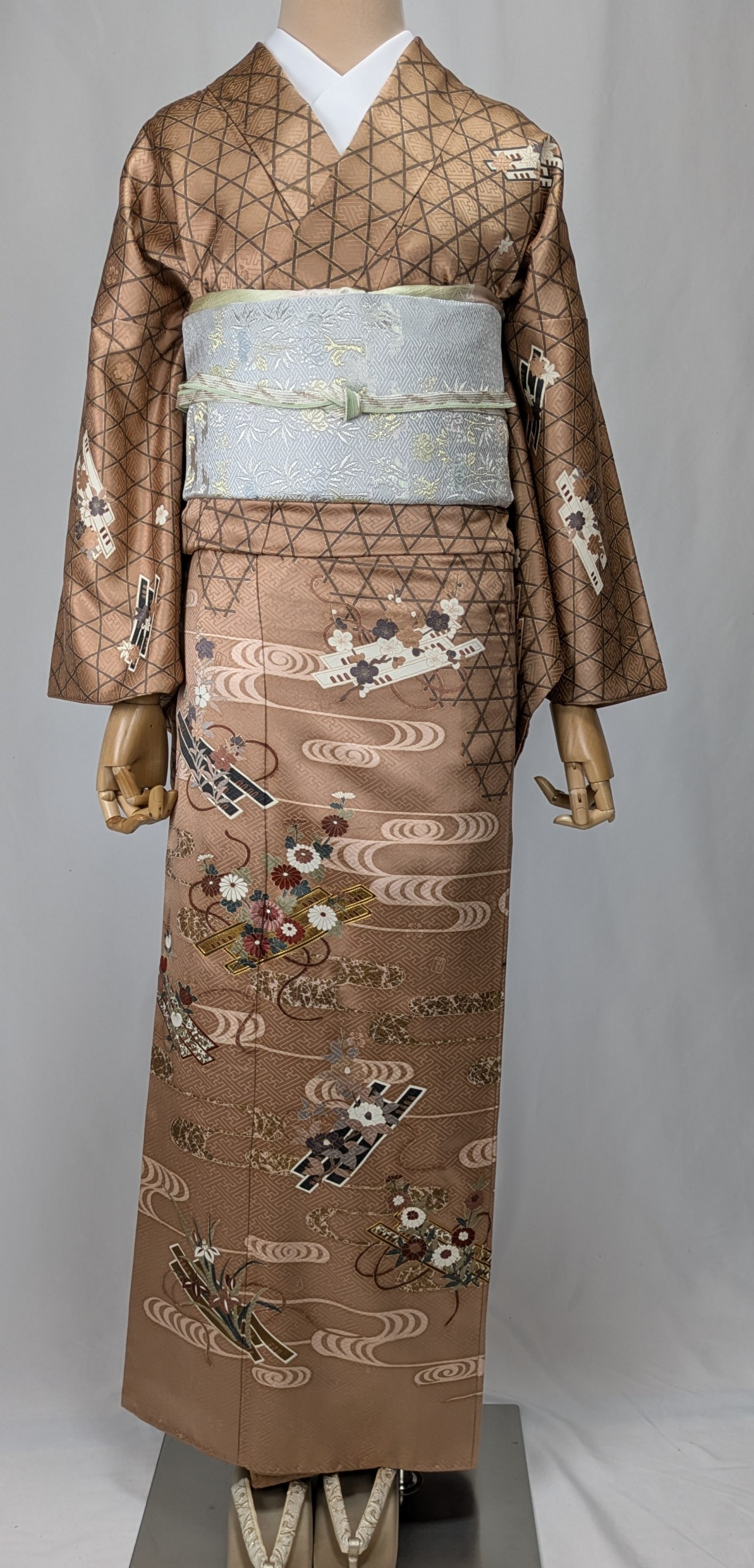 優雅な色合いの観世水が流れる生地に、かごめ文様と草花が繊細に描かれており、さまざまなシーンで華やかさを引き立てます。